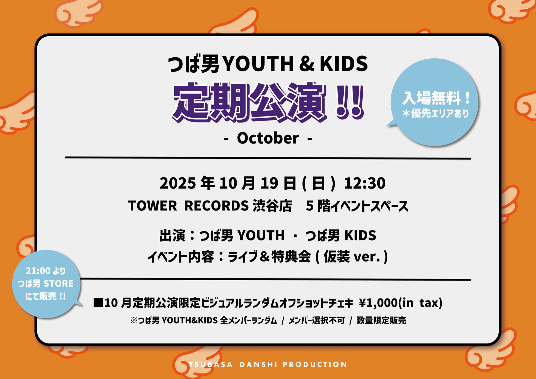 【NEWS】10月19日(日) 「つば男YOUTH & KIDS 定期公演 – October -」開催決定!!さらに、21時よりつば男STOREにて数量限定チェキ販売決定!!(2025.10.7更新)